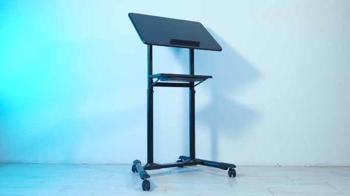 Що ж це тоді таке? Сталевий пересувний столик для презентацій. Дві платформи, чотири колеса, основа з колесами виконана в вигляді трапеції, щоб було менше шансів перевернутись. Верхня частина розміром 600×400 мм може вмістити ноутбук, витримує до 20 кг і нахиляється вперед на 30°, фіксуючись гвинтами знизу. Нижня полиця розміром 400×215 мм витримує до 10 кг.